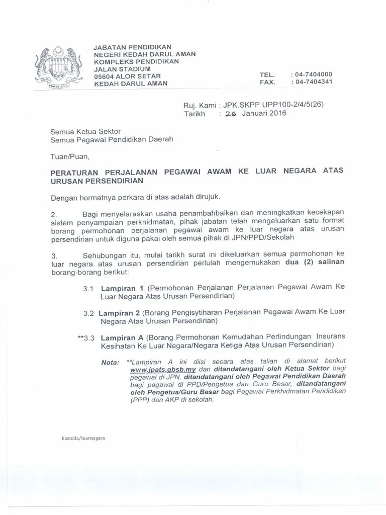 Contoh Surat Kebenaran Ke Luar Negara Pemjawat Awam. Emel Jika ada. 3 Tahun 2012 mengenai Peraturan Perjalanan Pegawai Awam Ke Luar Negara Atas Urusan Persendirian.